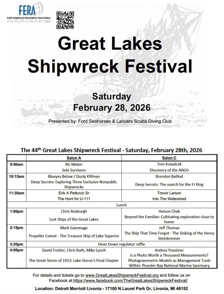 Saturday, February 28th – Great Lakes Shipwreck Festival Detroit Marriot Livonia 17100 N. Laurel Park Drive, Livonia, MI. 48152