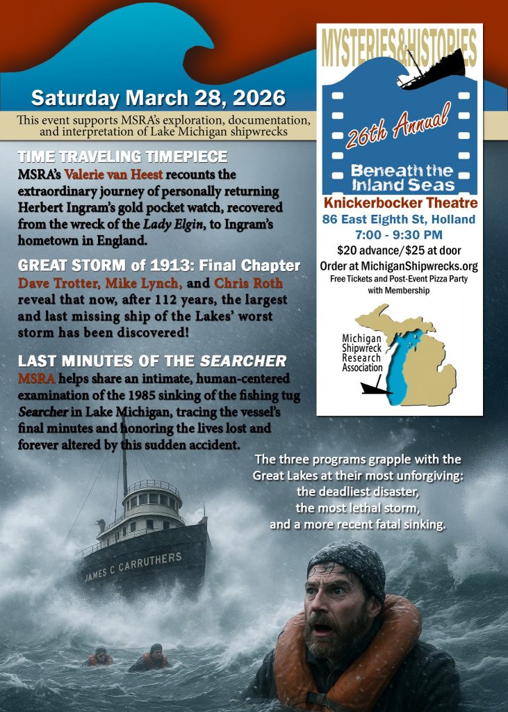 Join us at the Mysteries and Histories – Beneath the Inland Seas in Holland, MI as we present “The Great Storm of 1913: The Final Chapter”. We can now tell the complete story of the lost shipwrecks on Lake Huron during that fateful storm with the discovery of the James Carruthers in 2025.